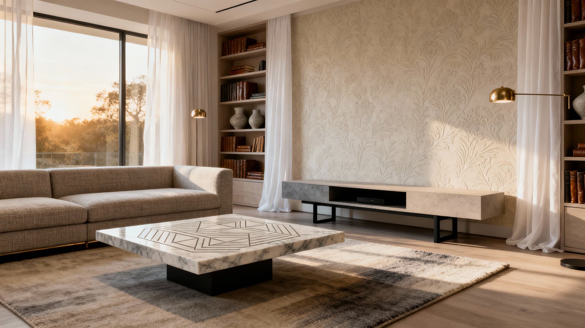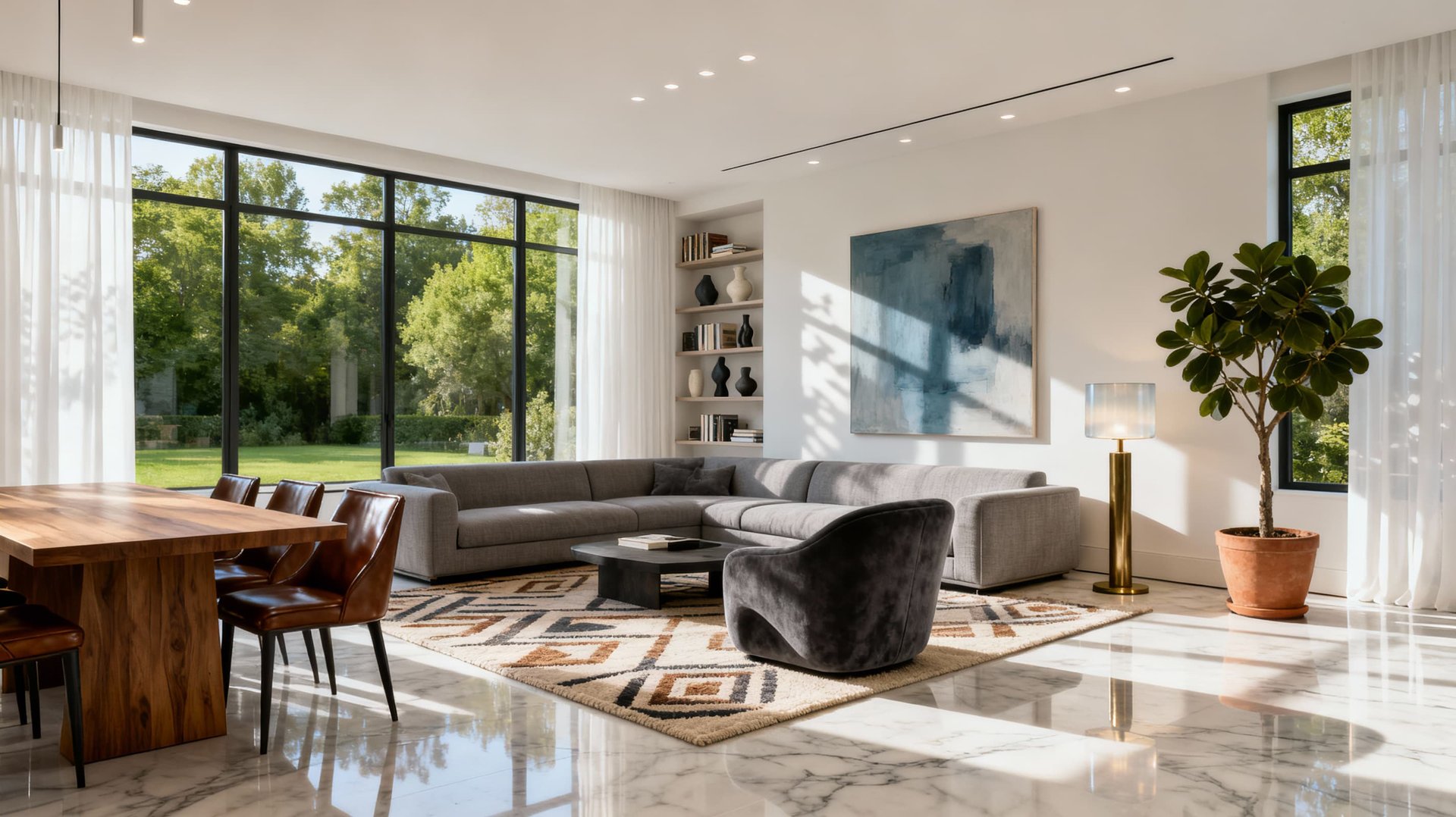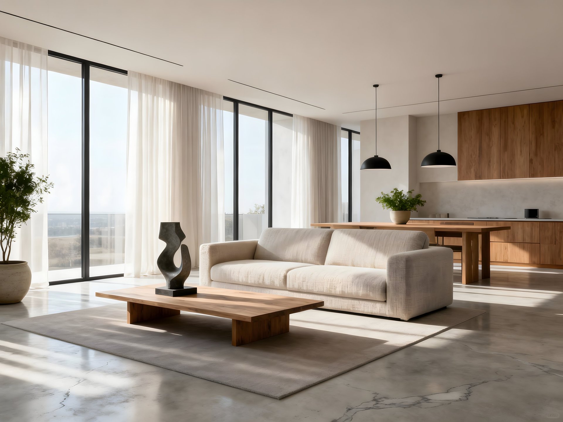 Architectural minimalist sofa design anchors spacious interiors with refined tactile luxury.