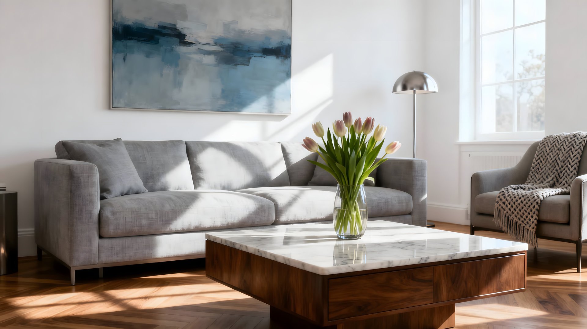 Warm wood tones and abundant natural light define this spacious, curated living area.